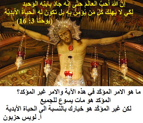 عِبارةُ “لِكَي لا يَهلِكَ”: تُشيرُ إِلى أَنَّ يَسوعَ الَّذي هُوَ الكَفّارَةُ عَن خَطايا العالَم. يَقولُ القِدّيسُ يُوحَنّا الإِنجيلِيّ: