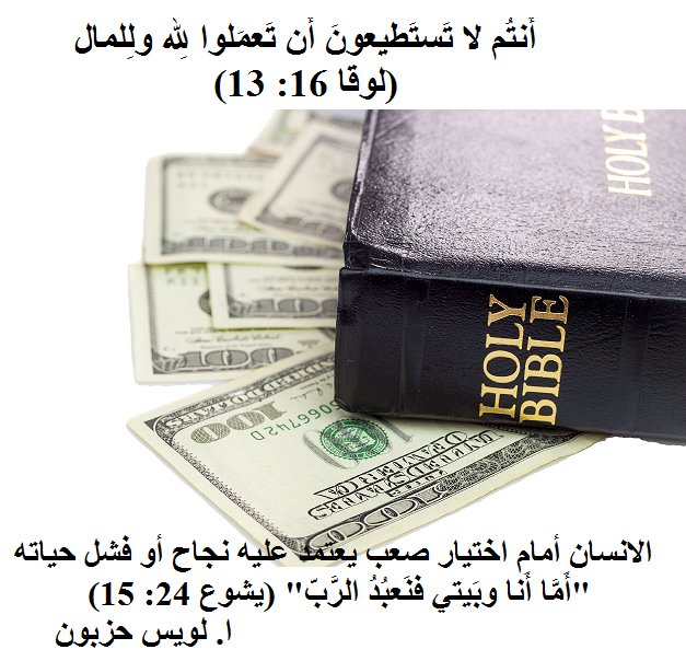 “المَالُ ” الكَلِمَةُ اليُونَانِيَّةُ: μαμωνᾶ تُشِيرُ إِلَى “المَالِ كَسُلْطَانٍ يَسْتَعْبِدُ العَالَمَ” (لو 16: 9). إِنَّهُ سَيِّدٌ مُخَادِعٌ، يَعِدُ صَاحِبَهُ بِالسِّيَادَةِ وَالقُوَّةِ، وَلَكِنَّهُ غَالِبًا لا يُوفِي بِوُعُودِهِ. ولا يُمْكِنُ لِأَيِّ قَدْرٍ مِنَ المَالِ أَنْ يَمْنَحَ الإِنْسَانَ الصِّحَّةَ، أَوِ السَّعَادَةَ، أَوِ الحَيَاةَ الأَبَدِيَّةَ. اللهُ لَيْسَ ضِدَّ الغِنَى، بَلْ ضِدَّ عِبَادَةِ المَالِ. فَمَنْ يَخْتَارُ اللهَ سَيِّدًا يَحْيَا فِي سَلاَمٍ وَرَجَاءٍ، وَمَنْ يَخْتَارُ المَالَ يَغْدُ عَبْدًا لِسُلْطَانٍ مُخَادِعٍ. وَالخِيَارُ فِي النِّهَايَةِ مَصِيرِيّ: نَحْنُ لا نَسْتَطِيعُ أَنْ نَعْمَلَ لِلهِ وَلِلْمَالِ.
