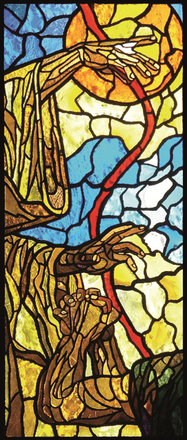 أما الزجاجية الثالثة، فتعتمد على اللون الأحمر وخلفيتها صفراء اللون. وهي مستوحاة من مزمور 98: “أنشِدوا للرَّبِّ نشيدًا جديدًا، فإنه صَنَعَ العجائِب”. بإتباعنا ليسوع، تصحبنا قوة محبته، المملؤة من النعمة والحق. ونفهم العلاقة بين السماء والأرض ونقطة الوصل بين هذين الواقعين، المعبَّر عنه في الصورة على شكل أوراقٍ من اللون الأحمر الغامق والذي يلمس الأرض انطلاقاً من الأعلى في نقطة معينة. فهل صلاتنا نقطة التحام بين السماء والأرض؟